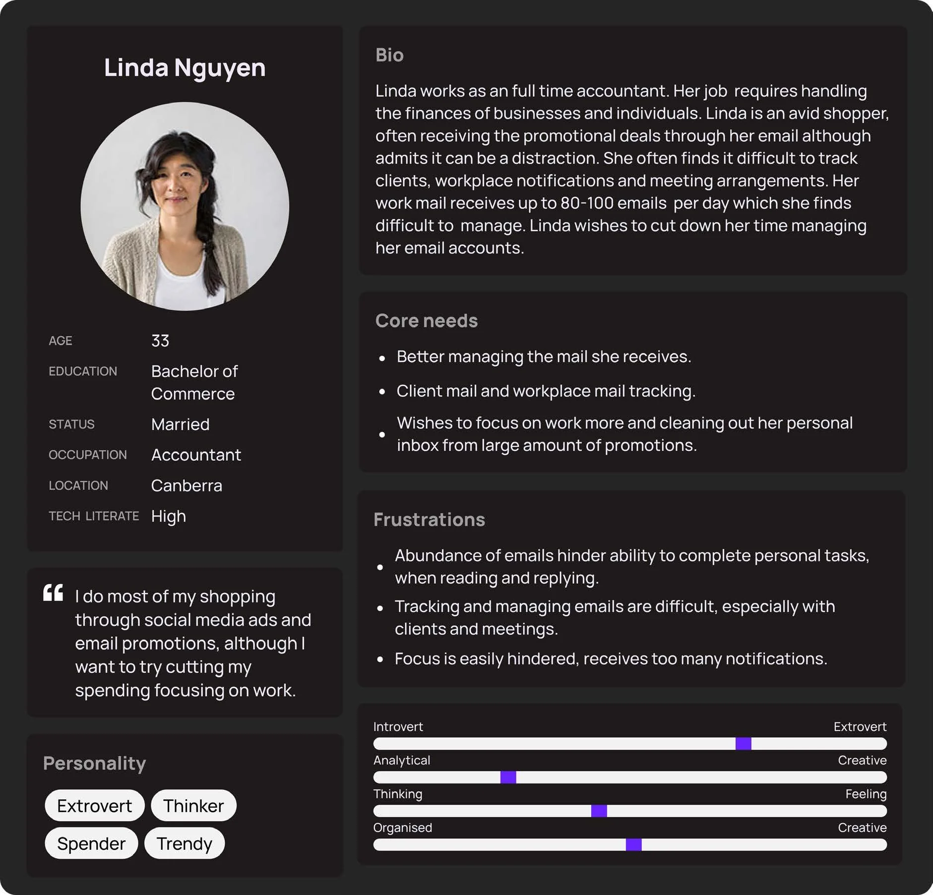 User research comprised of three full-time working adults, 2 male and one female. The ages of those interviewed, included a 24 and 56-year-old male and a 57-year-old female. All three interviewed frequently and heavily use email within the working week, one of them rarely uses personal email.