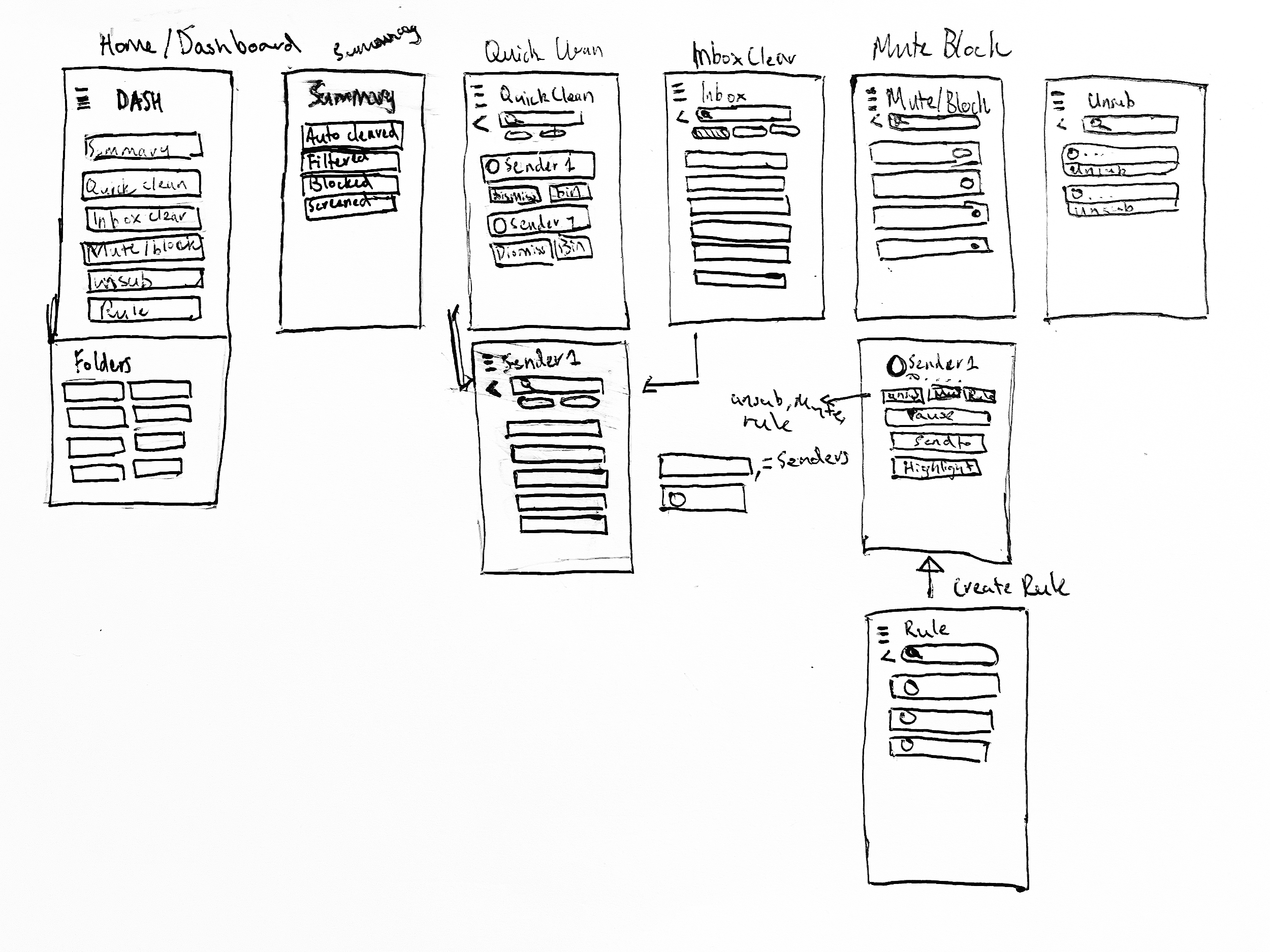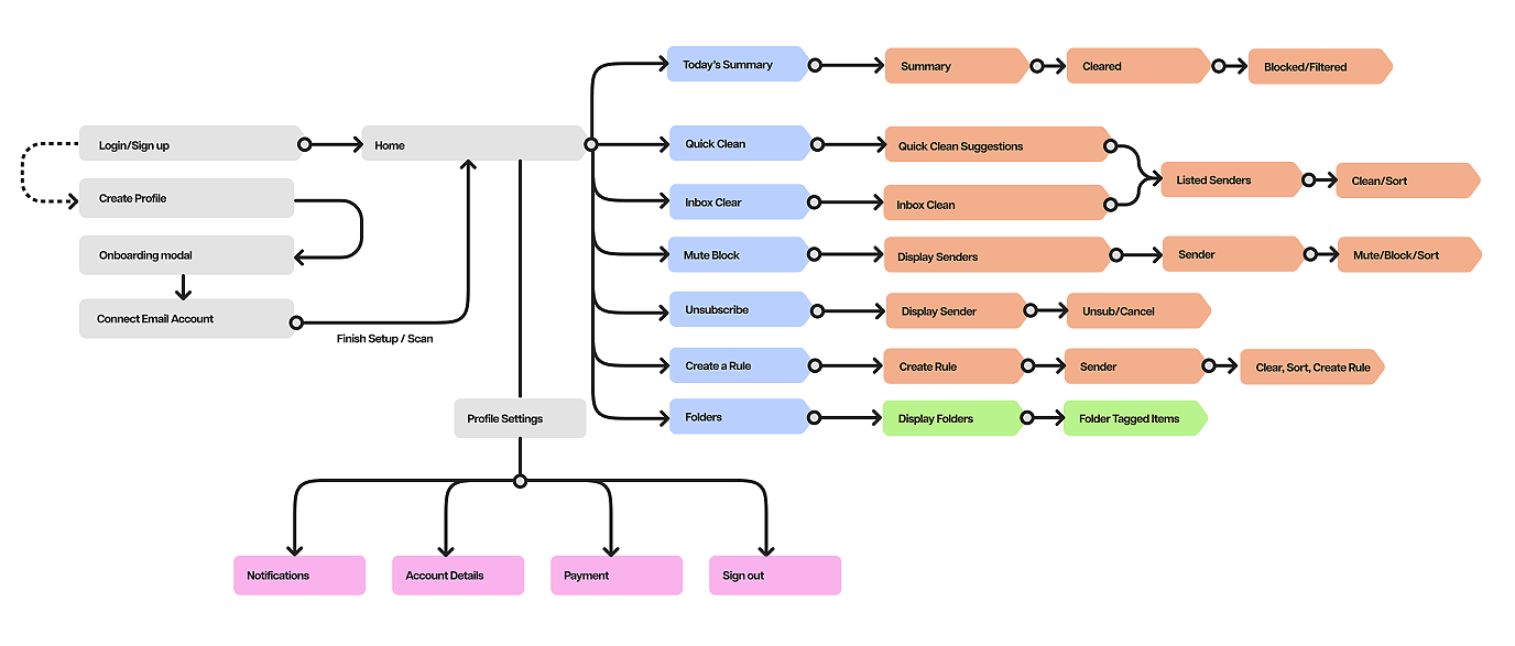 3. Most app functionalities are accessable from the dashboard(home), otherwise accessed through athe side menu. The navigation is split into 3 dropdowns; profile settings, tools and quick access. Profile settings relate to app settings, payments, accounts, help and terms and conditions. Tools relate to functions that sort and clean emails, and quick access resembles your standard email UI, for easy access without switching between apps.
