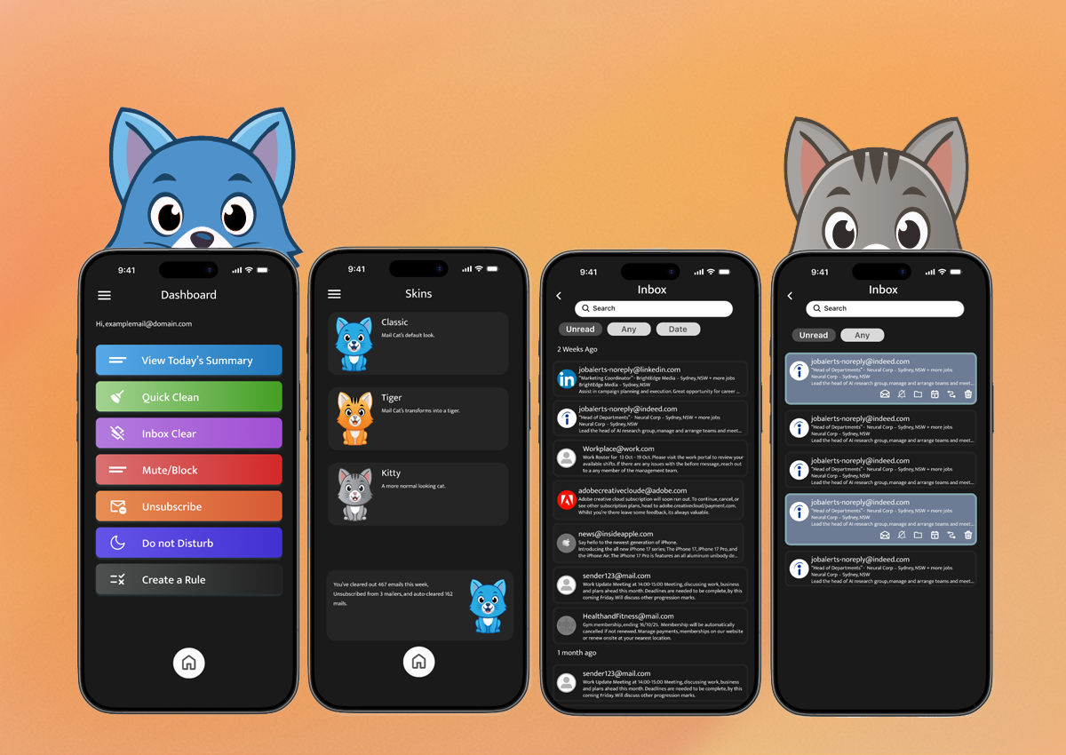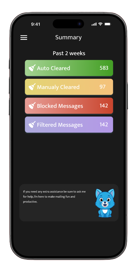 Get a bi-weekly summary of cleareed mails, blocked, and filtered messages. App will detect possible scam and spam mails to automatically be cleared. But will require one extra step to delete completely incase important mails slip through. The app mascot will appear giving these updates whilst also serving as a app guide.